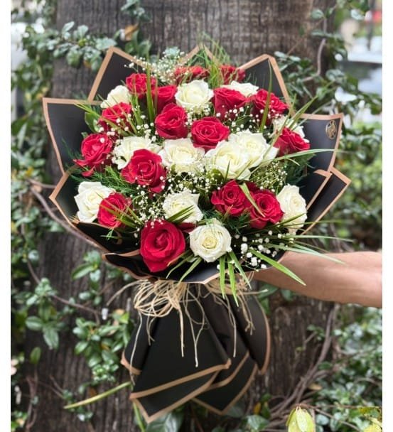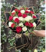 Vazo içerisinde 5 adet kırmızı gül, 2 adet beyaz gül ve kuru çiçeklerden oluşan