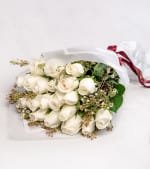 Cam vazo içerisinde 5 adet beyaz gül ve kuru çiçeklerle süslenen taze çiçek'le hazırlanan bir aranjmandır...